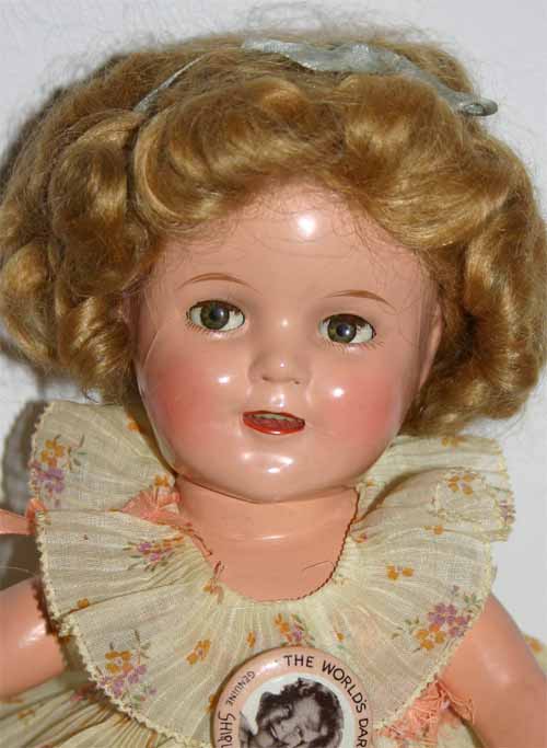 13" compo Shirley Temple doll from around 1938 with makeup, notice the eyeshadow and darker lipstick. Shirley is wearing a Curly Top dress with an unusual fabric pattern. It has flowers instead of the usual dots. This Shirley is extra rare because she has flirty eyes, unfortunately, the face of this doll cracks easily.