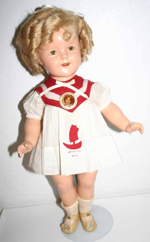 18" compo Shirley Temple doll from 1934. This Shirley was one of two that were owned by sisters (the other is the one in the Anchor dress). They are in incredible condition, but you can really see how different they are from the later dolls, note the very pale coloring, and light blond hair and loose curls. Shirley is wearing a very rare early Sailboat dress, this dress wasn't in a movie, but was one from Shirley's personal collection and was seen in some of the earliest pictures of Shirley with the Shirley Temple dolls.