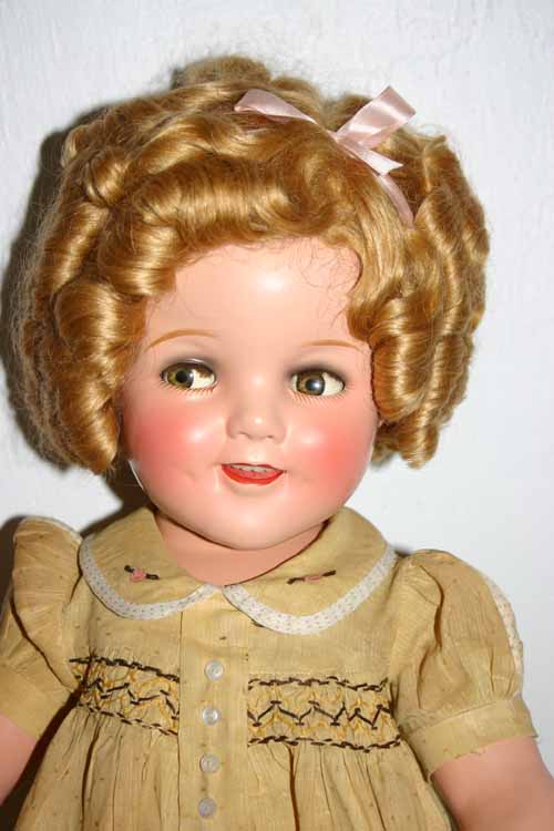 22" compo Shirley Temple doll from 1936. Now, this is one gorgeous doll. I paid more for this doll than any other in my collection, but as you can see, she is worth it!! This is a mint 22" Shirley Temple with makeup, note the eyeshadow and very high coloring. Her eyes are flirty (only the makeup dolls would occasionally have flirty eyes - except for 25" and 27" dolls) and incredibly they are still clear!! Just a gorgeous doll!! Her dress is also very rare, its from the movie Stowaway and is so hard to find!
